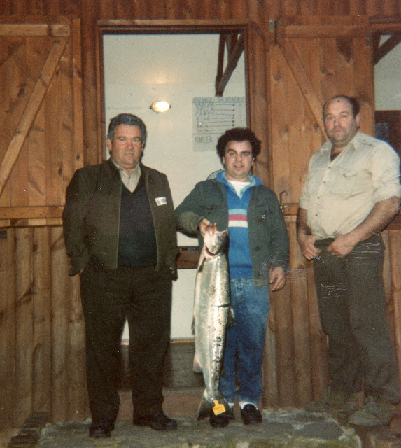 carlos costales, me pregunto que donde iba y le comente el caso a lo cual dijo voy contigo lo que dije que bueno, llegamos a las mestas y fuimos directamente a la pumariega ya que supuse que estarian alli, baje la caña por si acaso y tenia razon, pues cuando llegamos los vemos del otro lado del pozo sentados en el regodonal, yo les dije que hacian, que pasaran pa este lado cosa que hicieron, mientras que yo me puse a mirar desde el arbol de la pumariega lo cual veo una mancha que alumbraba, no paraba de pegar pequeños bandazos, yo no daba credito fue entonces que baje y le dije a carlos que si para el aquello era un salmon, a lo que me dijo que no que para el era una marroxa, a lo cual le dije a ver si es una marroxa o no, trae la caña y empeze a preparar y cuando tenia preparado dijo carlos, dirigeme tu que lo ves bien, en esto carlos desplego toda la caña a lo que le dije que cerrara caña que el salmon estaba muy arrimado que bastaban 4 tramos en esto que empieza a cerrar los tramos con la quisquilla encima del agua, en esto sale el salmon y coge el cebo clavandose solo a lo que carlos exclama ! ya ta ¡ a lo que le dije vaya marroxa, el quedo blanco.........